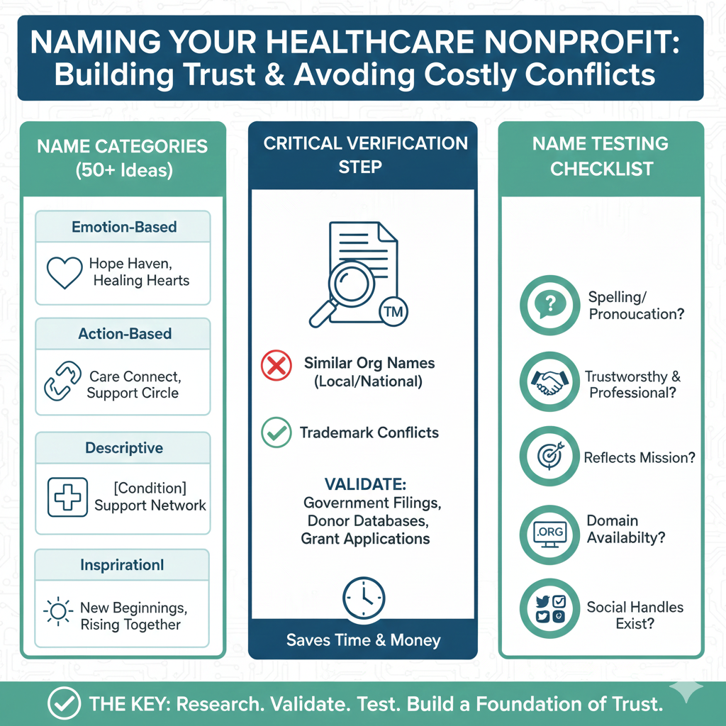 Critical verification step: Before you fall in love with a name, confirm that similar organization names don’t already exist in the healthcare nonprofit space, both locally and nationally. Trademark conflicts are especially problematic for nonprofits because rebranding requires updating all government filings, donor databases, and grant applications. This validation takes time but prevents costly complications down the road.